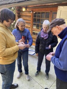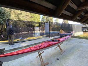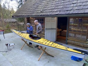 Saturday morning dawned sunny but cool. Six of us met in North Van and under Maureen’s direction, prepared ourselves for giving our kayaks a facelift. Ken provided the venue, as well as fresh coffee and a box of Tim’s donuts. I sensed it would be a good day.