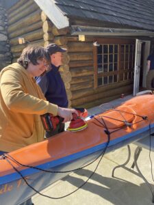 By lunch time, my work area was in the shade and I was chilly. A quick bite, then Eric and I moved inside the cabin and helped Libby work on her boat. Pictures, cut, measure, replace. We met the challenge of all the knots head on, with occasional help from Maureen and You Tube. By the time we gathered outside again, we were feeling the pride of accomplishment. The other boats were all done and Katie was polishing her new-to-her Guide 17, restoring it to its original beauty.