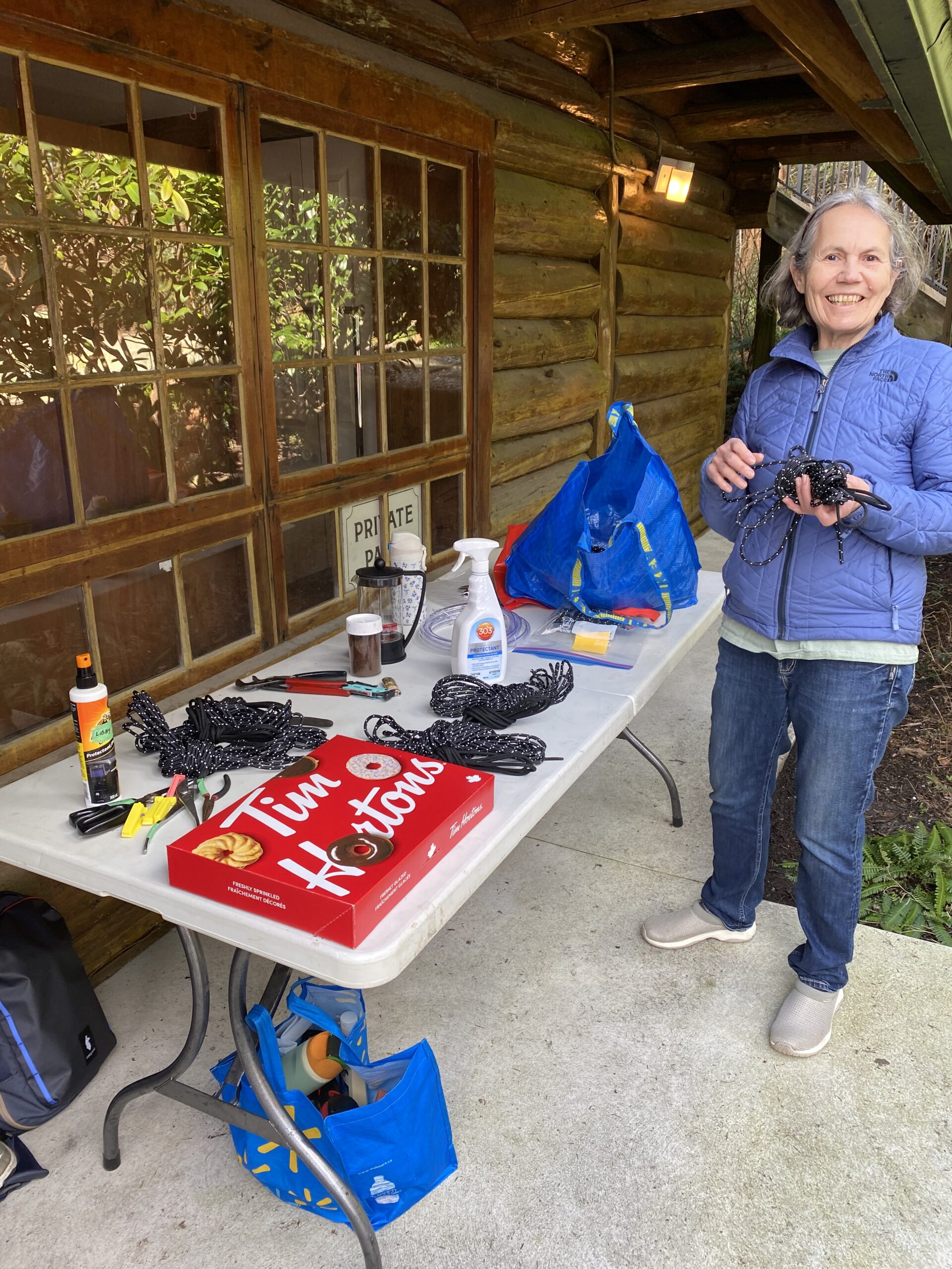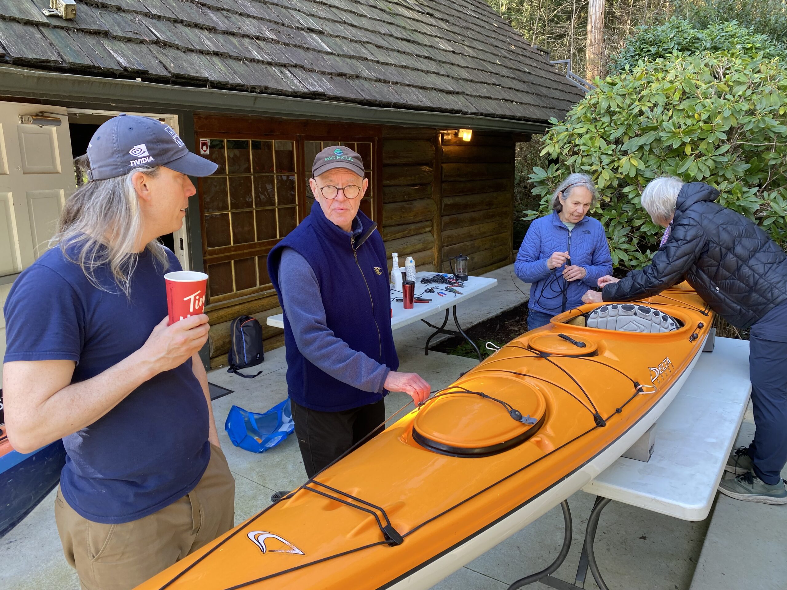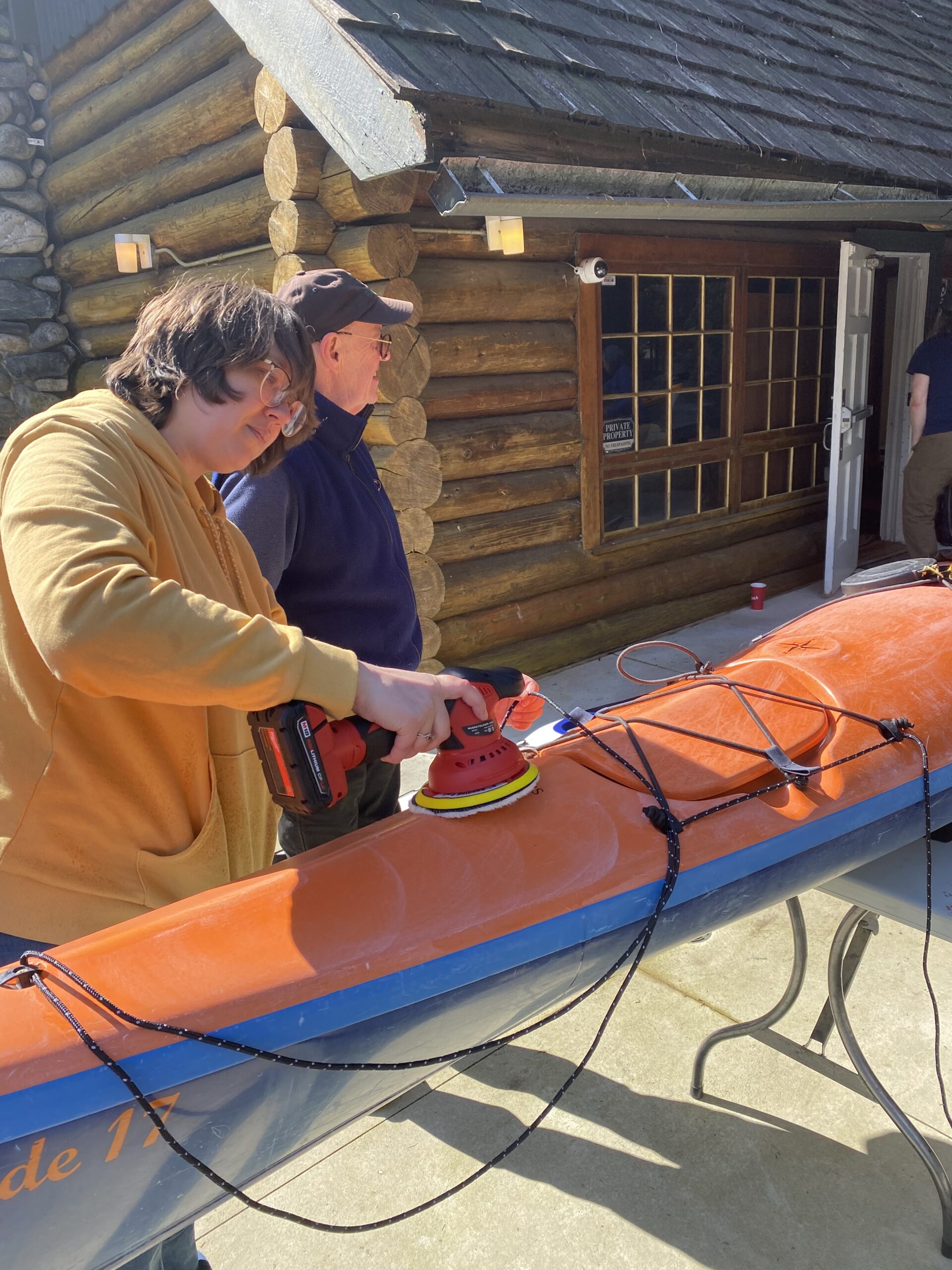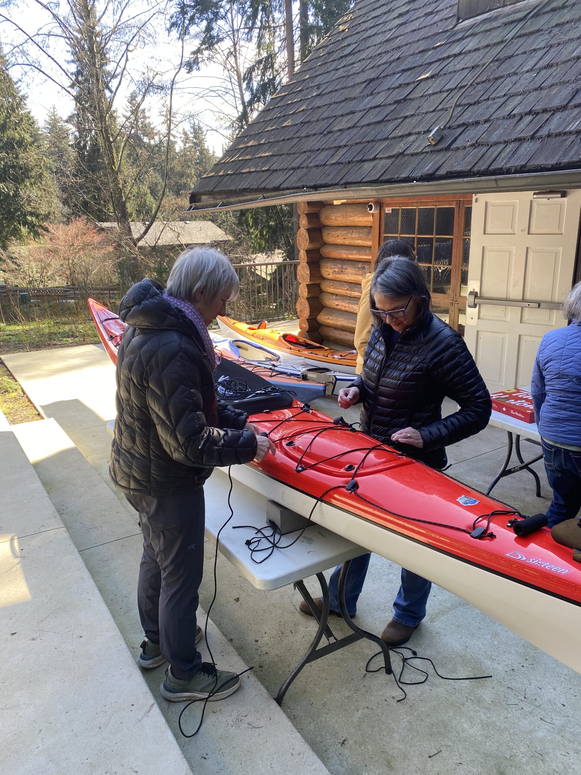 Saturday morning dawned sunny but cool. Six of us met in North Van and under Maureen’s direction, prepared ourselves for giving our kayaks a facelift. Ken provided the venue, as well as fresh coffee and a box of Tim’s donuts. I sensed it would be a good day.